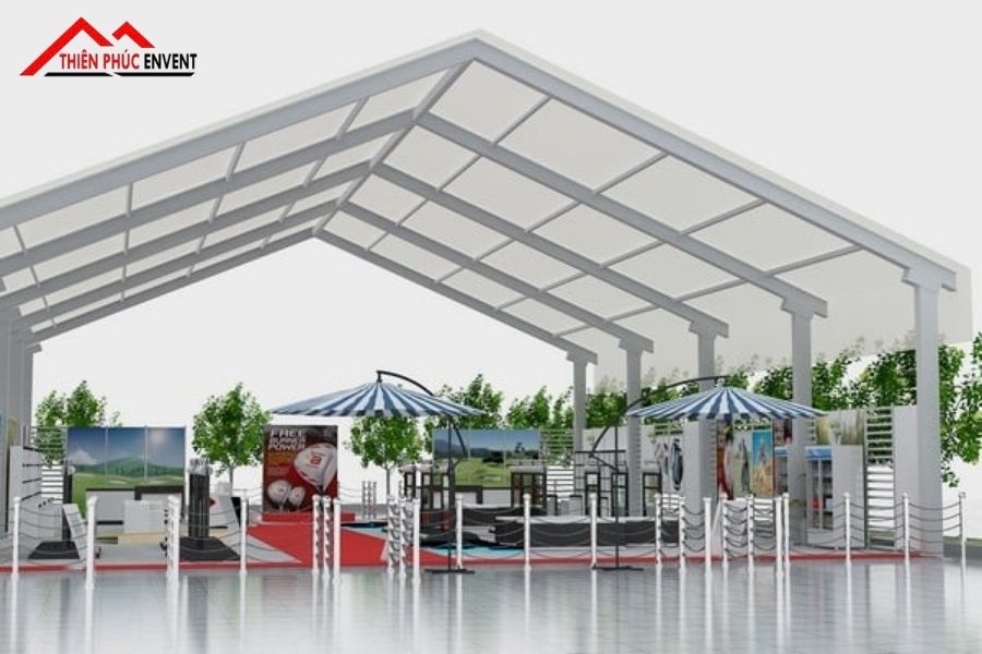 Loại nhà bạt này được ưa chuộng trong các sự kiện lớn nhờ kết cấu nhẹ nhưng chắc chắn. Khung truss nhôm dễ thi công, phù hợp với các không gian rộng như khuôn viên SECC hoặc khu đô thị Phú Mỹ Hưng. Bạt mái thường sử dụng loại 2 da cách nhiệt, giúp giảm nhiệt và tạo sự thoải mái cho khách mời.
